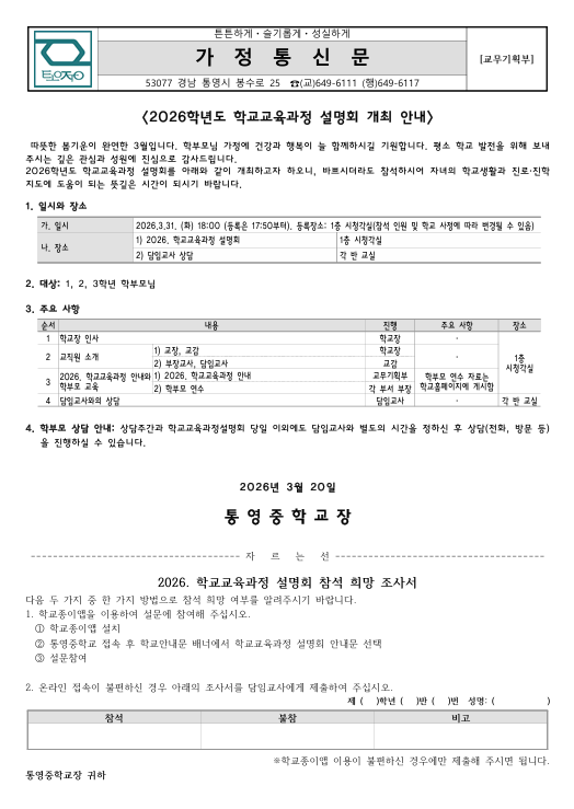 2026학년도 학교교육과정 설명회 개최 안내 가정통신문