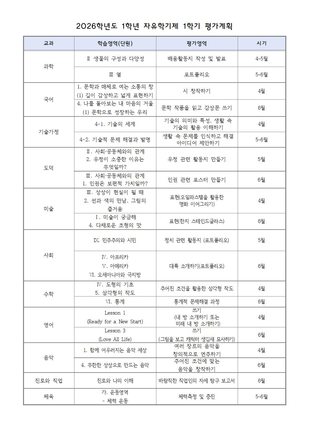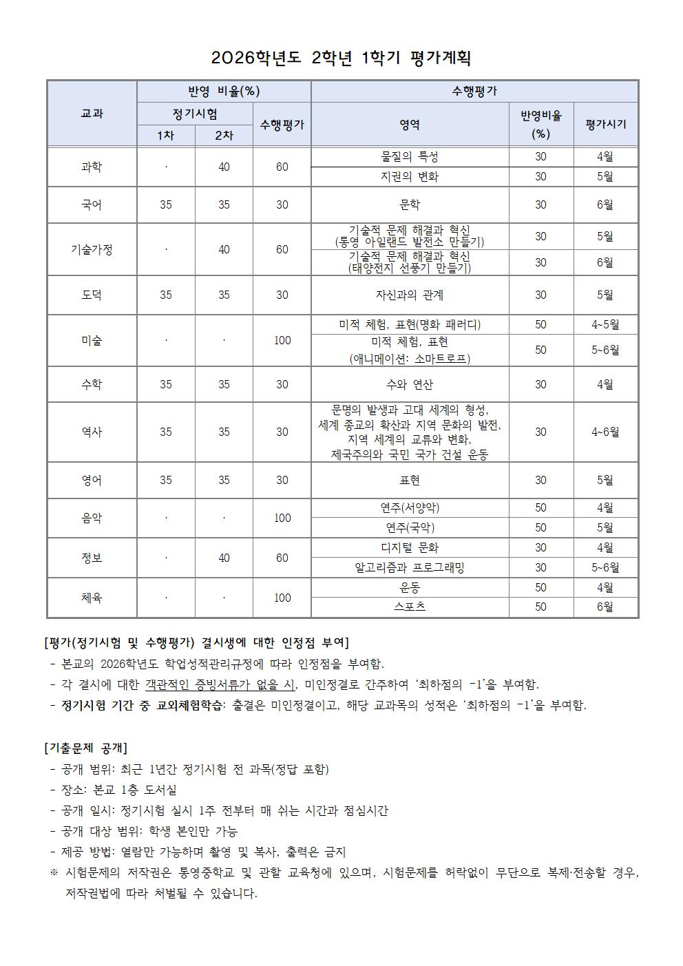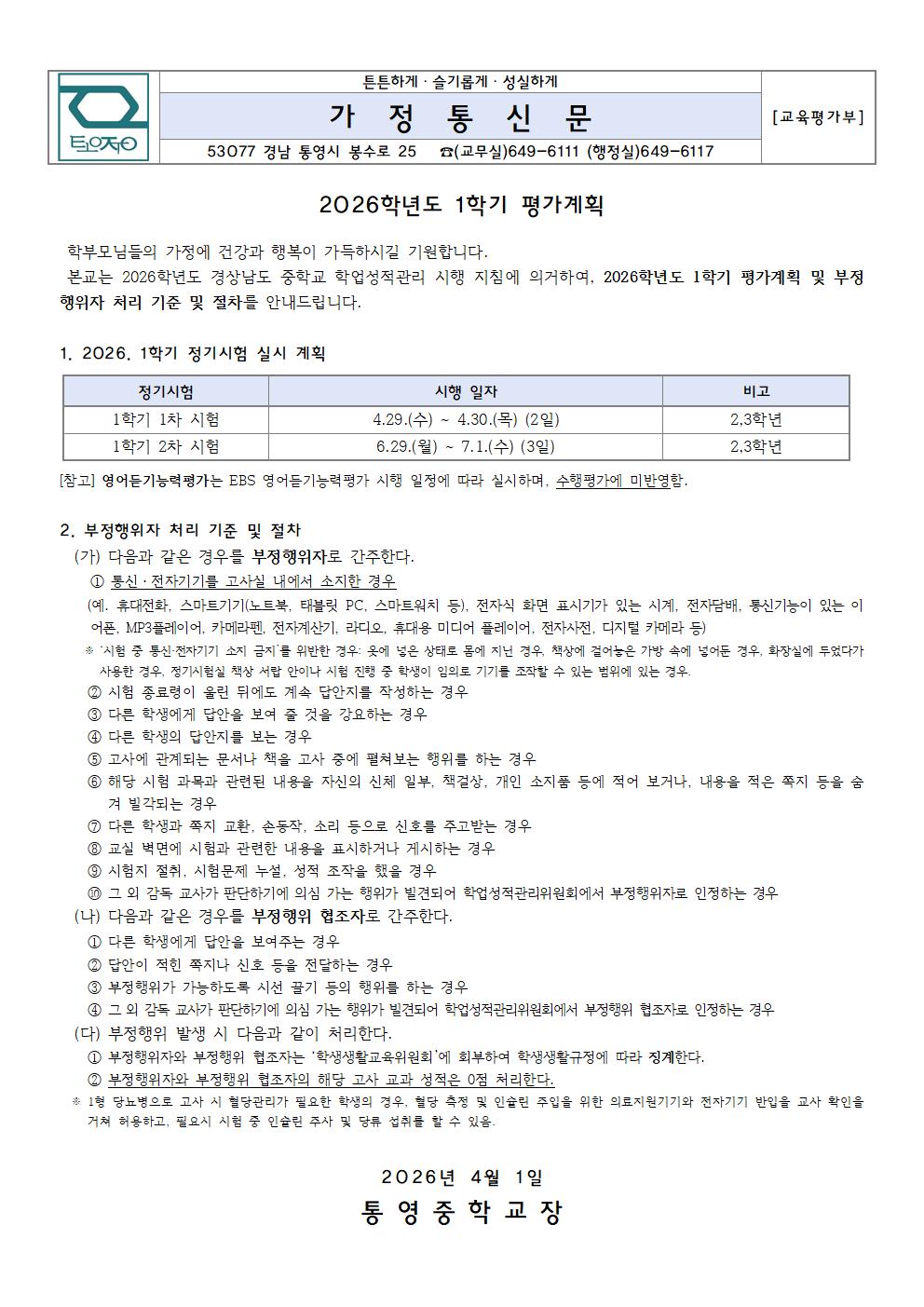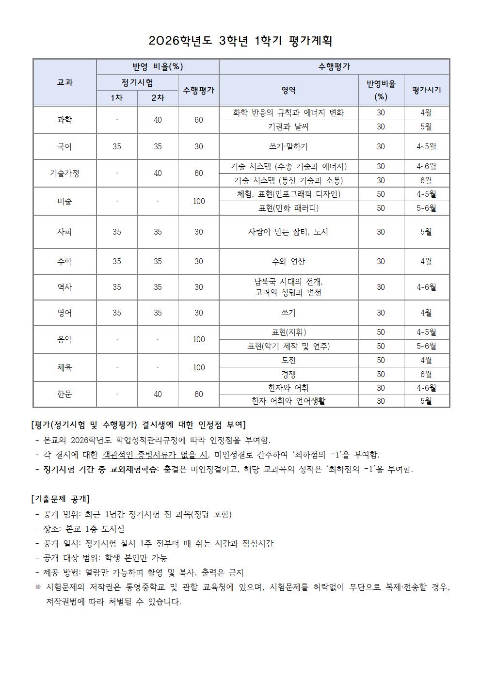 2026학년도 1학기 평가계획 가정통신문
