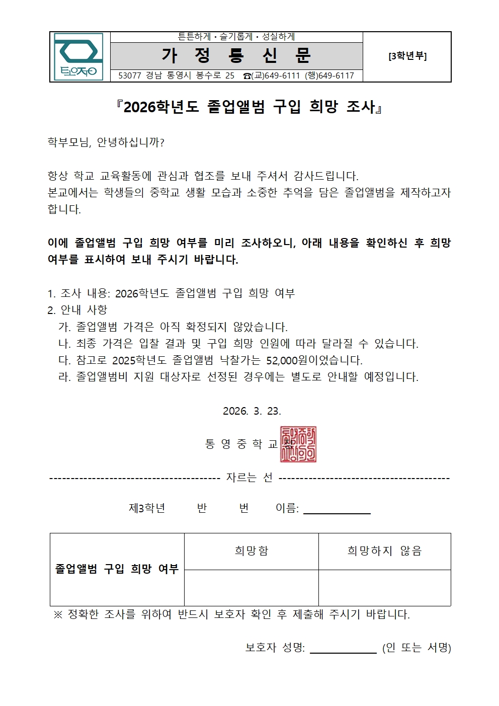 2026학년도 졸업앨범 구입 희망 조사 가정통신문