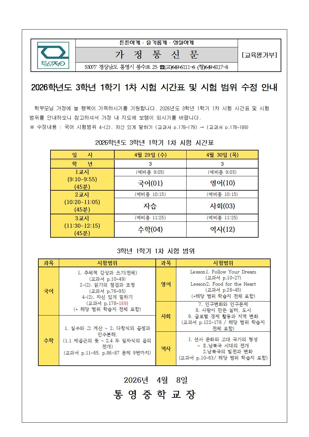 2026학년도 3학년 1학기 1차 시험 시간표 및 시험 범위에 수정 사항이 있어 수정 안내드립니다.