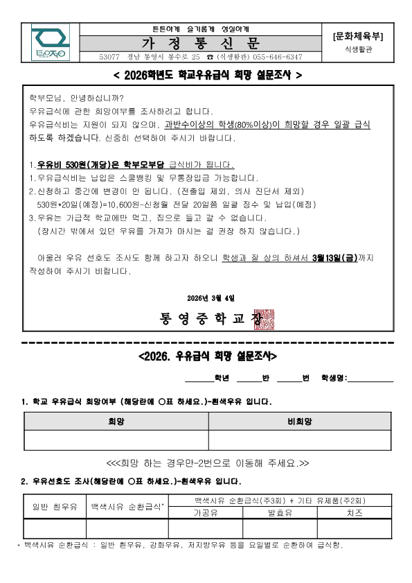 2026학년도 학교우유급식 희망 설문조사 가정통신문