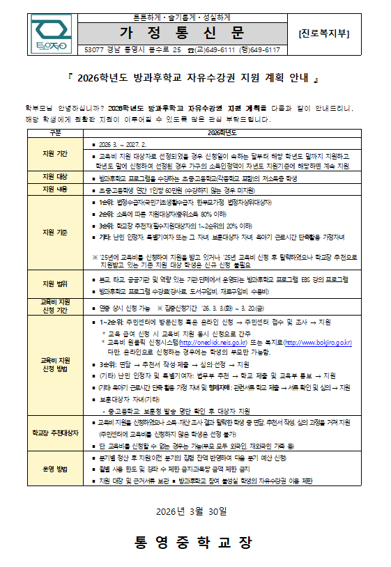 방과후학교 자유수강권 지원 계획 안내 가정통신문입니다.