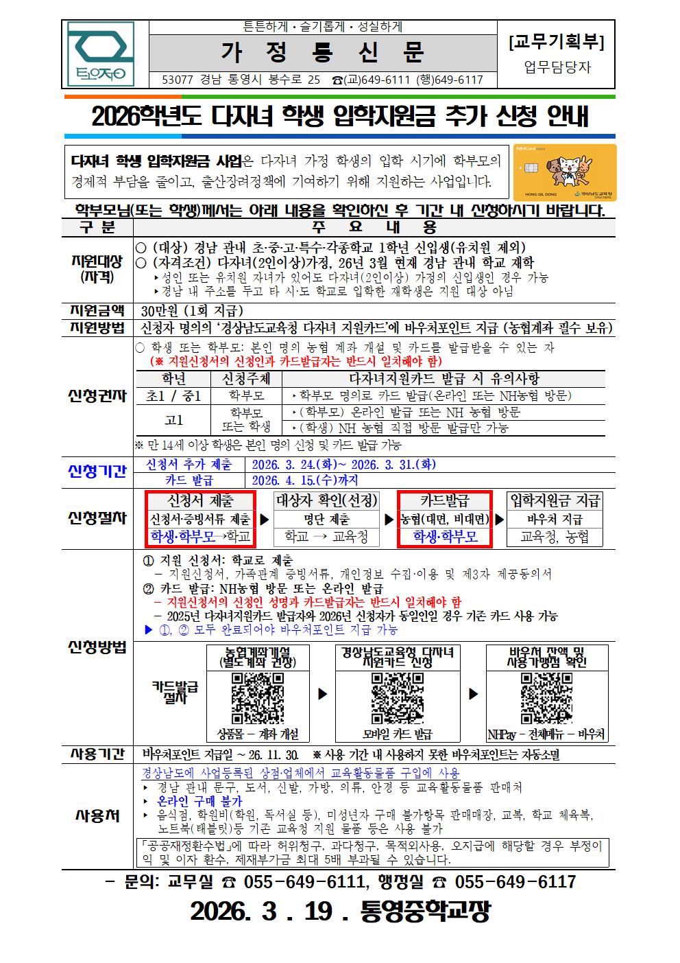 2026학년도 다자녀 학생 입학지원금 추가 신청 안내 가정통신문