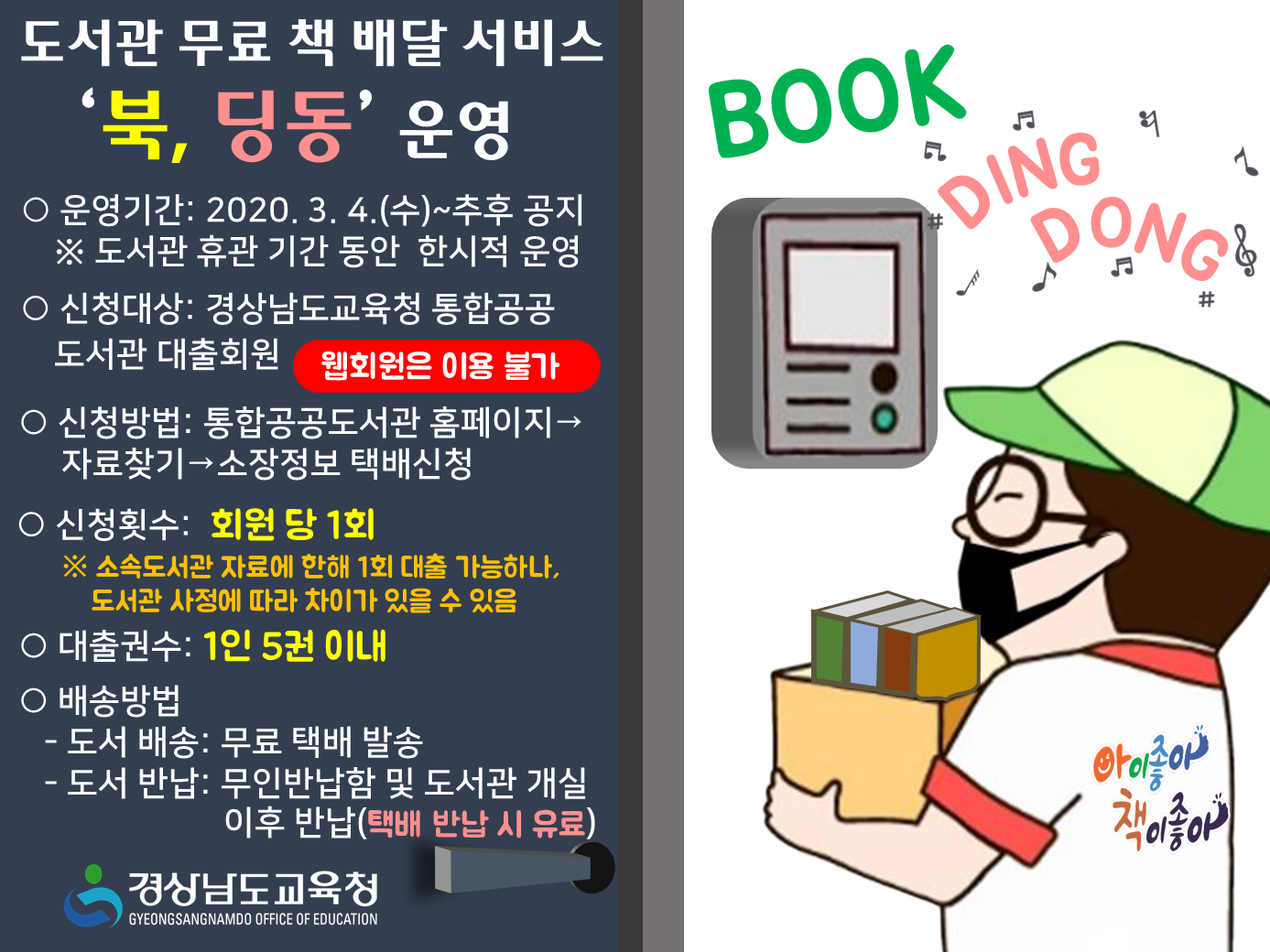 <도서관 무료 책 배달 서비스‘북, 딩동’> 코로나19 확산으로 인한 유치원 및 초·중·고교 개학 연기와 공공도서관이 휴관 중입니다. 경상남도교육청공공도서관에서는‘북, 딩동’ 무료 책 배달 서비스를 통하여 가정 내 독서생활화를 유도하고자 하니 학생 및 학부모님들은 많은 이용 바랍니다. 운영기간: 2020.3.4.(수) ~ 추후 공지 (※도서관 휴관 기간 동안 한시적 운영) 대상: 경상남도교육청 통합공공도서관 회원(웹회원 이용 불가) 신청횟수: 회원당 1회 무료 발송 운영방법 가. 대출권수: 1인 5권(소속도서관 자료) 이내 나. 신청방법: 경상남도교육청 통합공공도서관 홈페이지>자료찾기>소장정보 택배신청 클릭 다. 대출기간: 최대 한달까지 라. 도서반납: 무인반납함 및 도서관 개실 이후 반납(택배 반납시 유료)