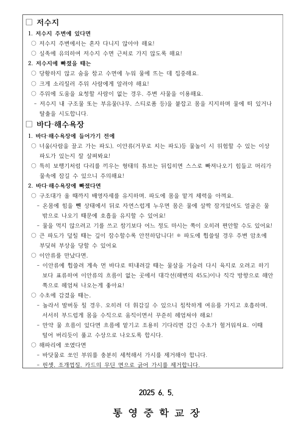 수상활동 안전사고 예방 안전수칙 가정통신문