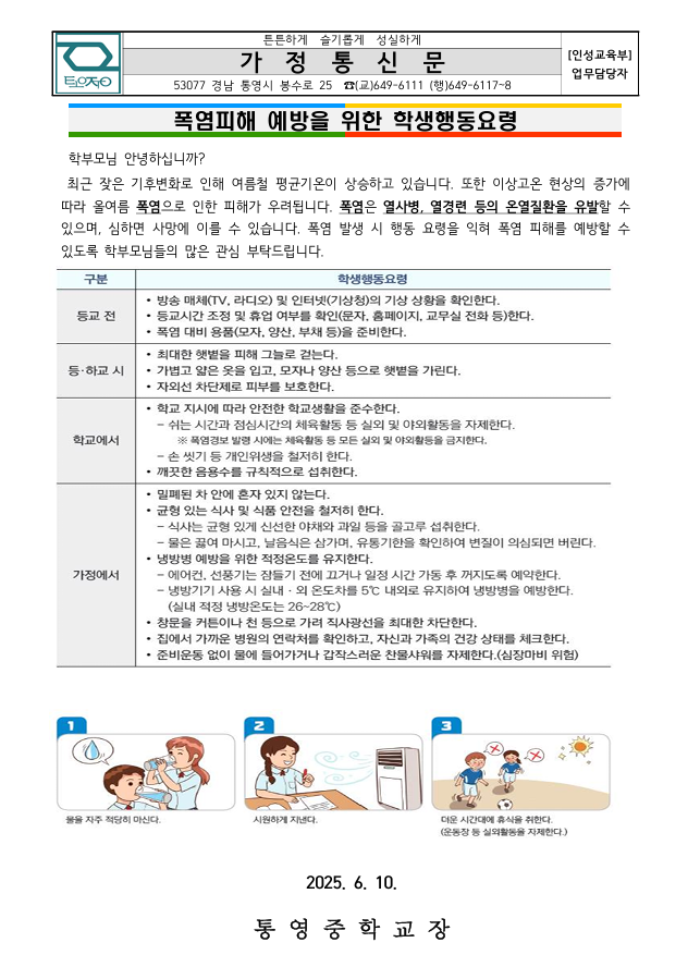 폭염피해 예방을 위한 학생행동요령 가정통신문