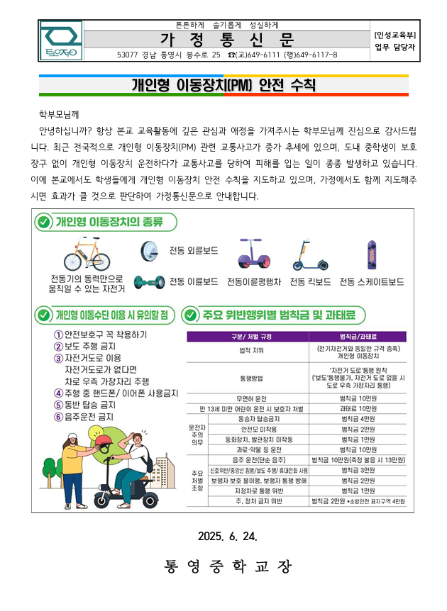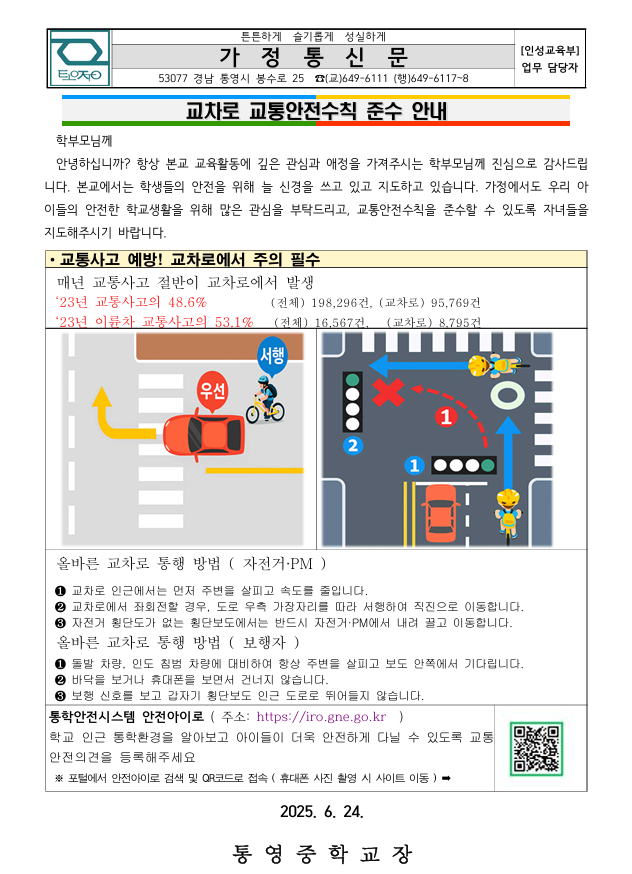 교차로 교통안전수칙 준수 안내 및 개인형 이동장치 안전수칙 가정통신문