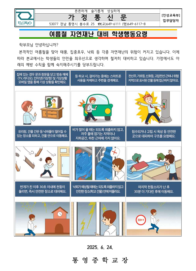 여름철 자연재난 대비 학생행동요령 가정통신문