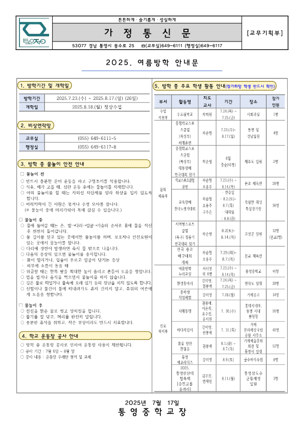 2025. 여름방학 안내 가정통신문