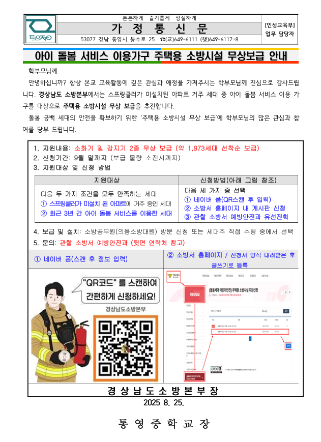 아이 돌봄 서비스 이용가구 주택용 소방시설 무상보급 안내 가정통신문