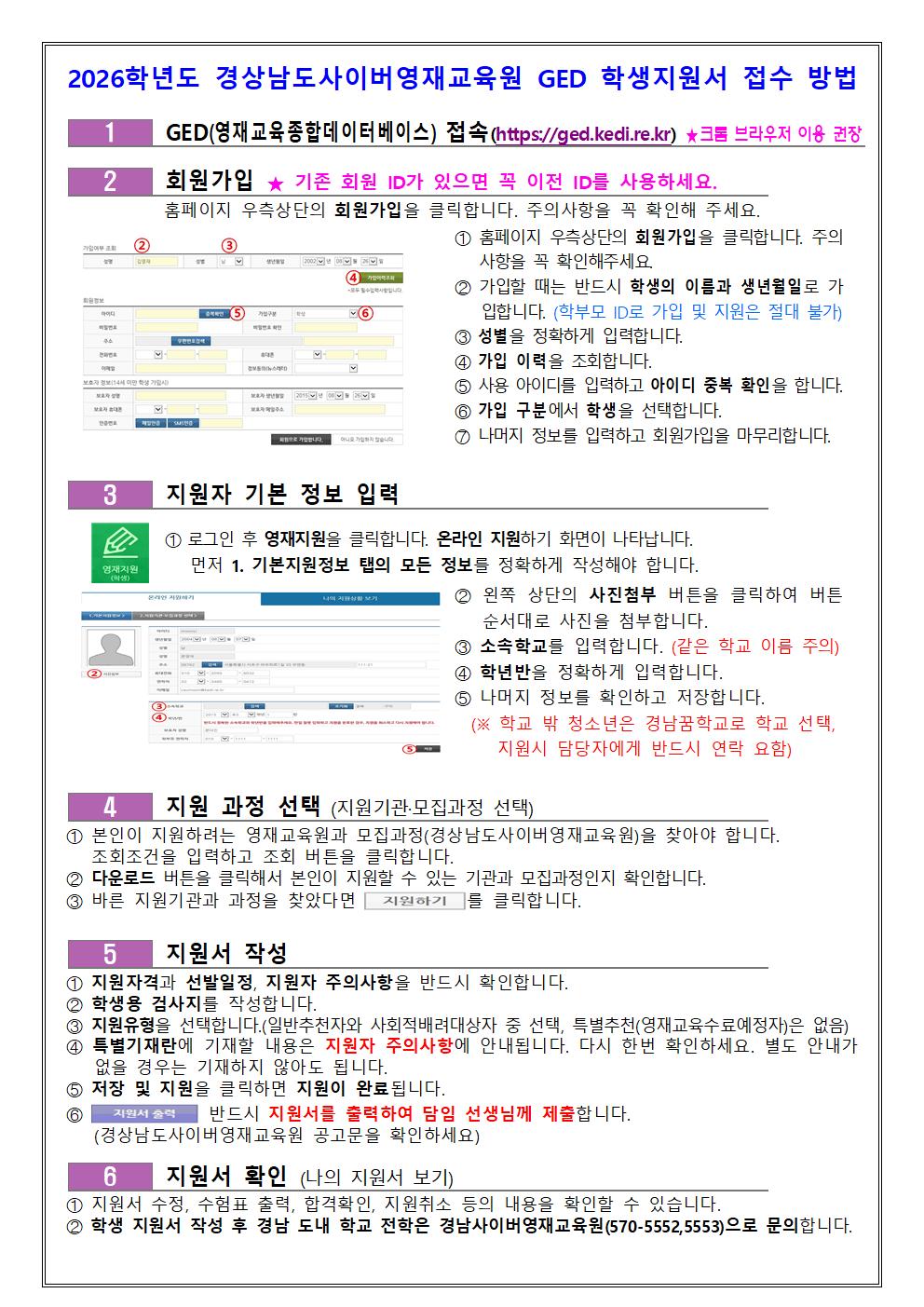 학부모님의 가정에 건강과 행운이 가득하시길 기원합니다. 경상남도사이버영재교육원에서 문학, 미디어, 사회 분야에 재능이 뛰어난 학생을 조기 발굴하여 유능한 인재로 육성하기 위해 2026학년도 영재교육대상자 신입생을 다음과 같이 모집하오니, 희망하는 학생들은 [GED(https://ged.kedi.re.kr)누리집]에 지원서를 제출해 주시기 바랍니다. 또한 지원서를 제출한 학생은 명단을 제출해야하므로 11/18(수)까지 담임교사 및 교무실(☎ 649-6111)로 연락바랍니다.