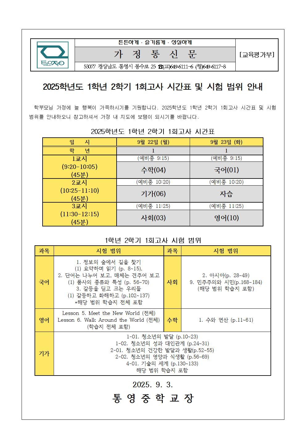 2025학년도 2학기 1회고사 시간표 및 시험 범위 안내 가정통신문