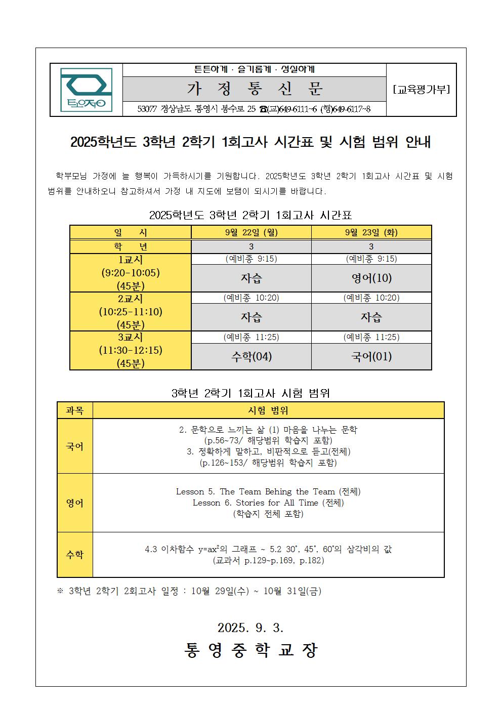 2025. 3학년 2학기 1회고사 시간표 및 시험 범위 안내 가정통신문.pdf