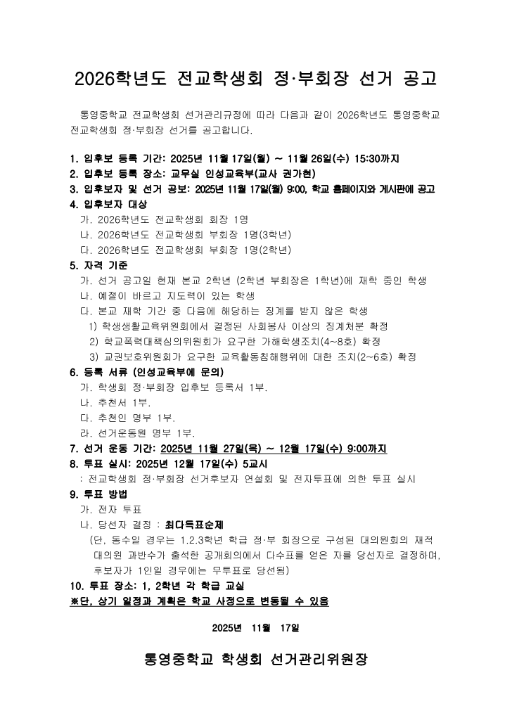 2026학년도 통영중학교 전교학생회 정·부회장 선거 공고