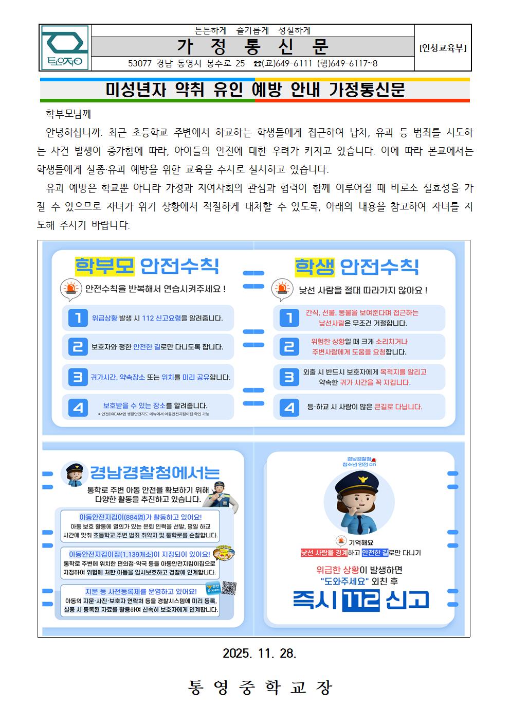 미성년자 약취 유인 예방 안내 가정통신문